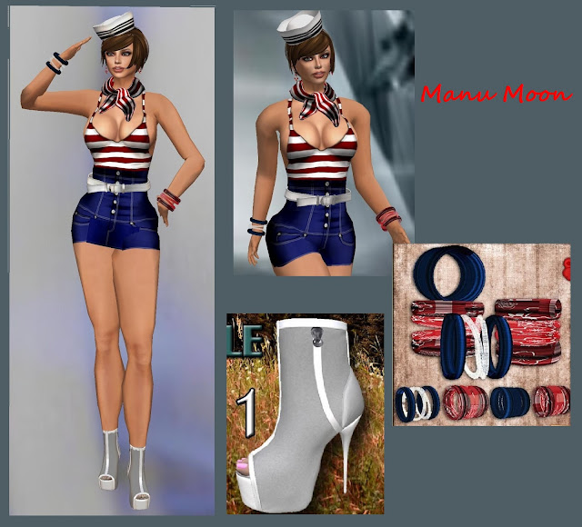 Então encerrando saga das fantasias, vamos navegar? Essa marinheira sexy com saia jeans, regata de listras estilo navy , cinto e lenço no pescoço é um presente de grupo da Gizza, o cap da Ice Age Industries está no Marketplace por L$ 0, como também as pulseiras da Funn Jewell lindas. A Ankle Boot branca com dedinhos de fora da Cliothe Luo custa L$1. os Cabelos já foram postados no blog são da Diva.